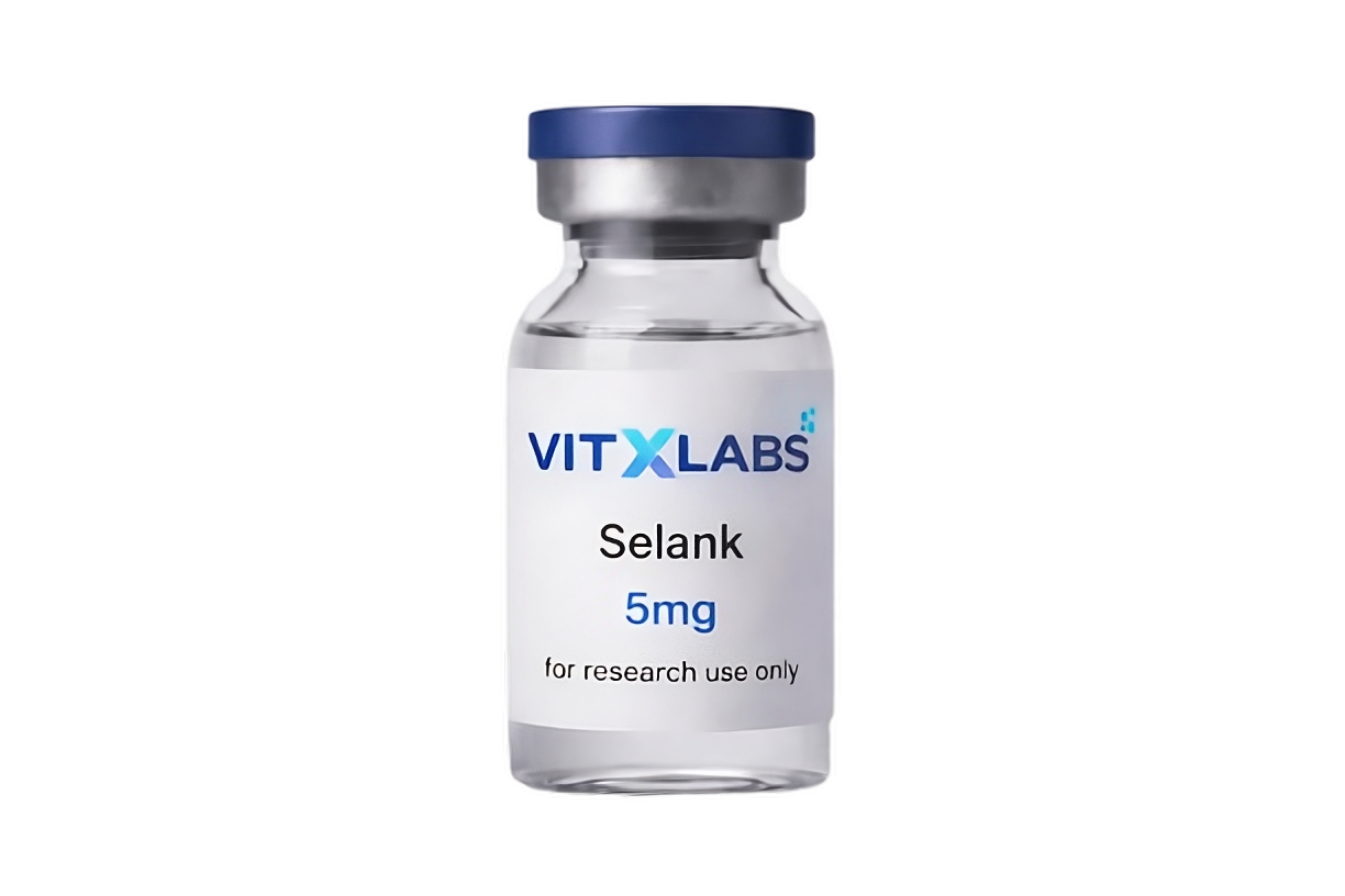 Lyophilized Selank (5mg) for research use. A synthetic heptapeptide analog of tuftsin, studied in immunomodulatory and anxiolytic signaling research.